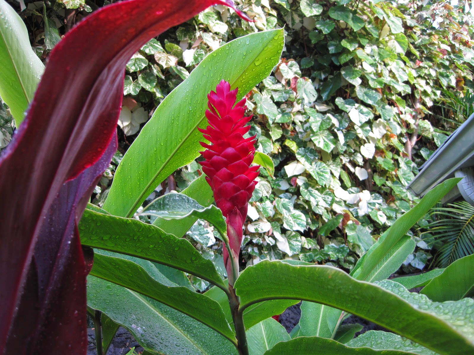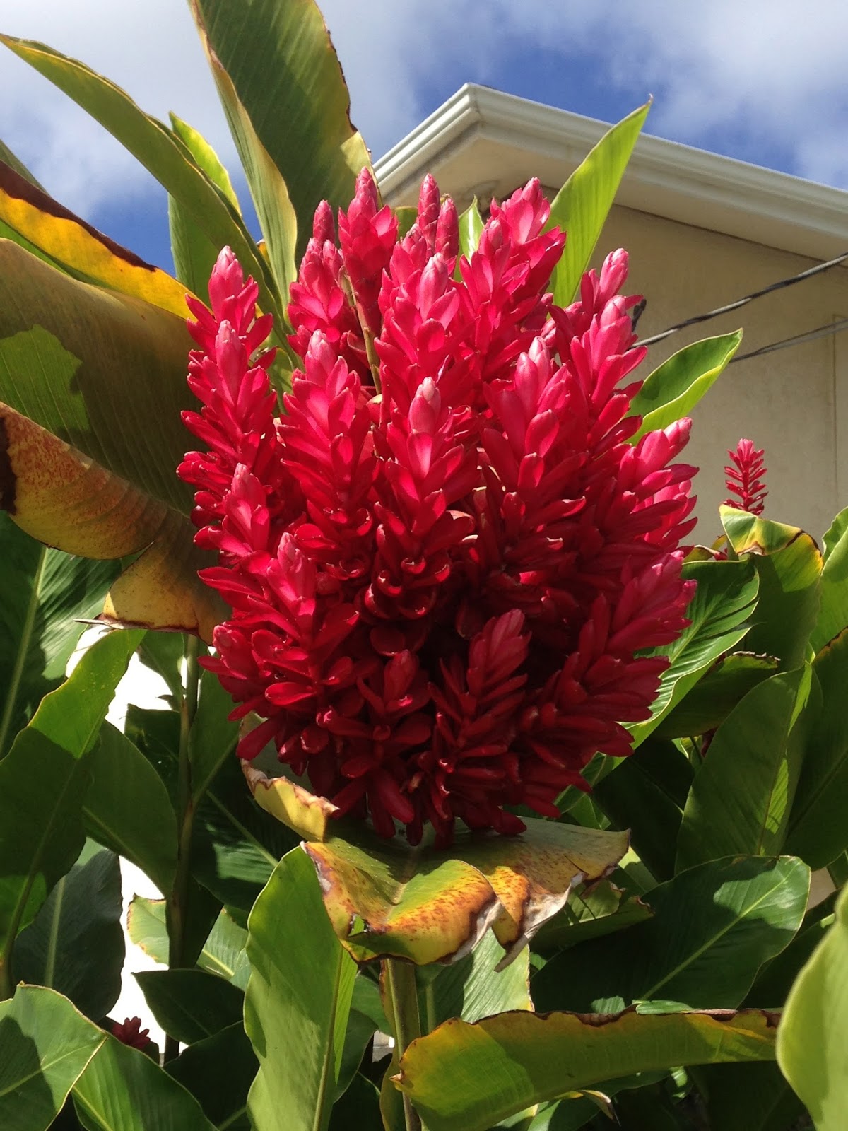 There's always a red ginger blooming somewhere in the yard! Supporting cast include red ti in front and variegated hau in the background.