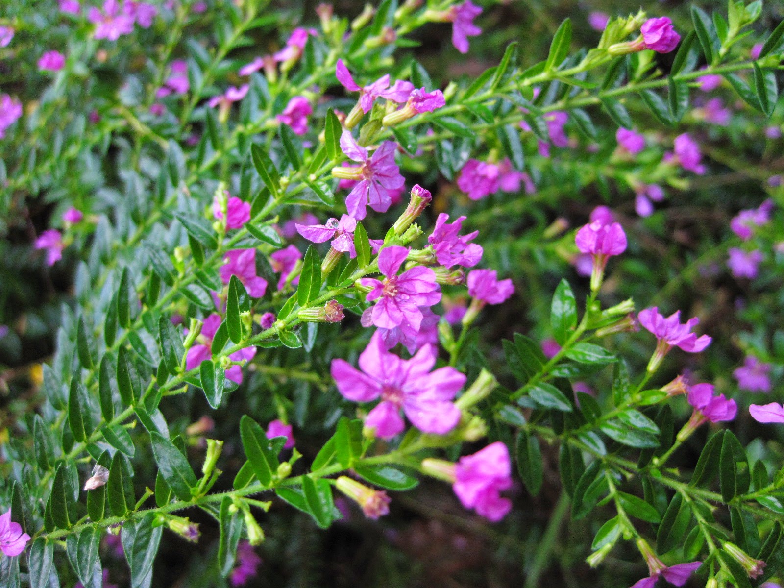 This little guy is ALWAYS in bloom, and it has as many names as it does flowers. Cuphea hyssopifolia is like the Mad Libs of heathers: false heather, Mexican heather, Hawaiian heather, (place where you live) heather
